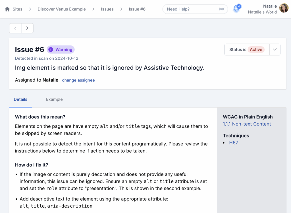 Issue Detail Page Showing Assignee, Issue Status and WCAG links and information.