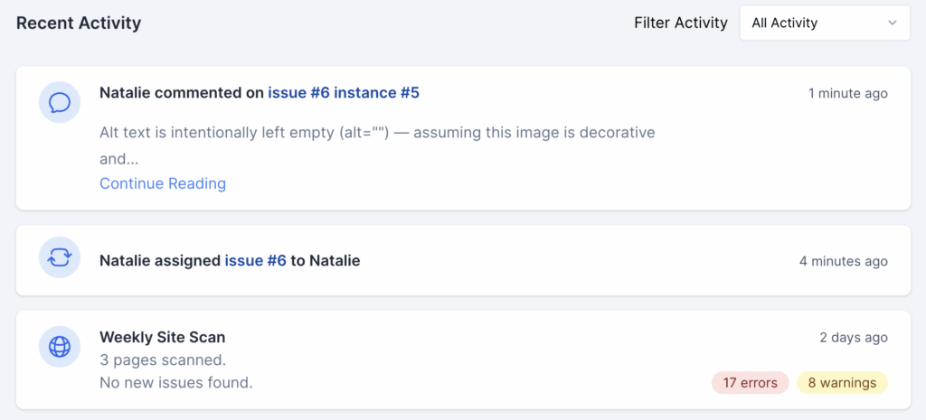 Activity feed showing a comment about decorative alt text, an issue assignment, and a scan summary.