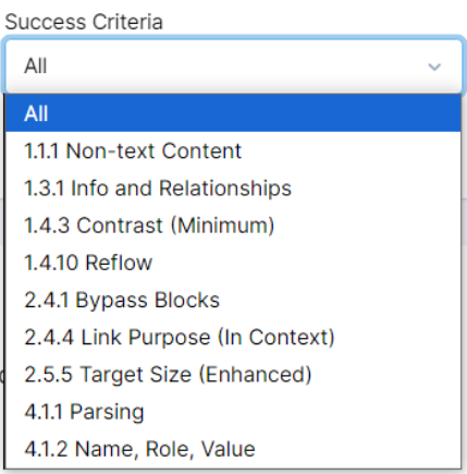 Issues can be sorted by WCAG Success Criteria. Depending on the Success Criteria of issues captured on the site, either through automatic or manual audits, these criteria will be listed out on the dropdown to use as filters.