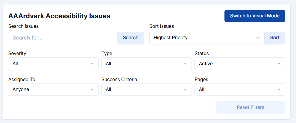 Use the filters in the Issues tab to search, sort, and prioritize accessibility issues. Filters include severity, status, assignment, and more, helping you focus on what matters most.
