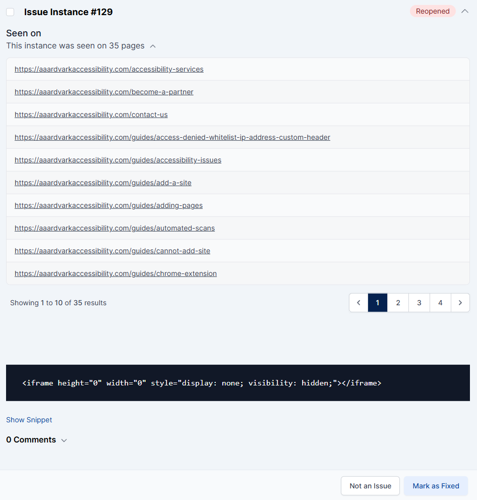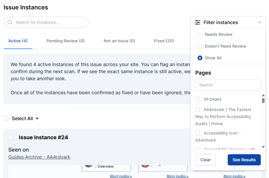 Instances can also be seen in a group of pages, allowing the ability to see where the issue appears with ease. Pagination is included if there are more than ten pages that the issue appears on.