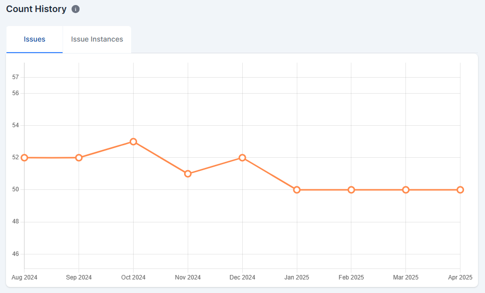 The Count History section in the dashboard provides a graph view of issues and issue instances over time, based on the most recent scan.