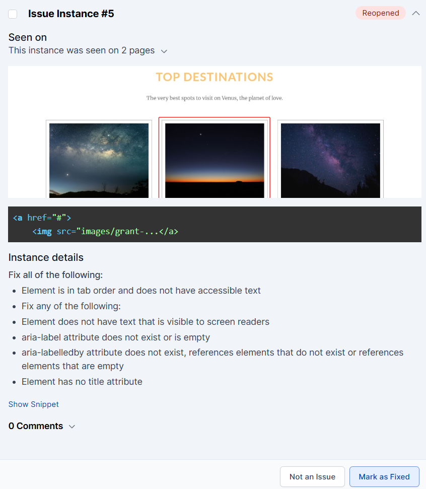 An issue is a type of accessibility problem (like missing alt text). An instance is each place where the problem shows up on your site. For example, if three images are missing alt text, that’s one issue with three instances. Instances help you see how widespread an issue is and where to fix it.