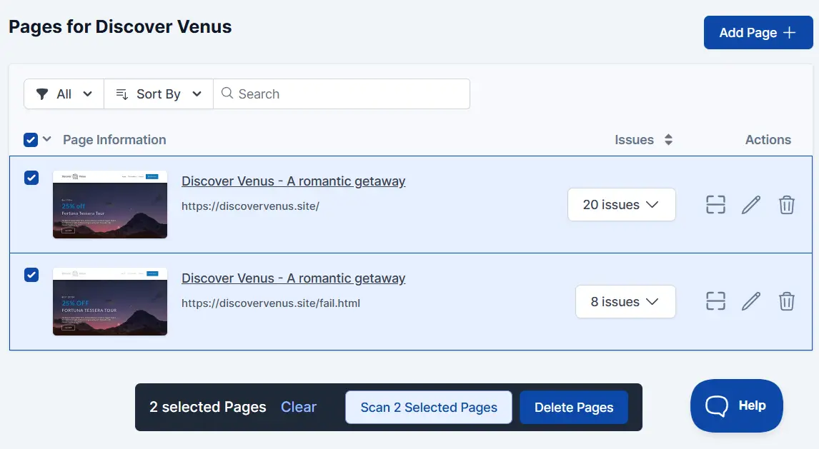 The pages listing table allows you to sort pages by issue count or by using the sort filter options listed below: