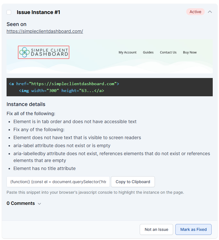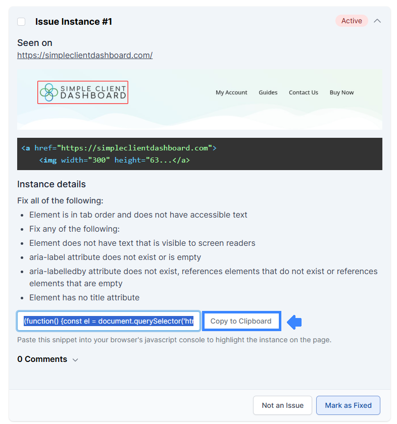 After running a site scan, you might need a quick way to locate the specific element causing an accessibility issue. With AAArdvark, you can use JavaScript snippets to find the affected element directly on your website.