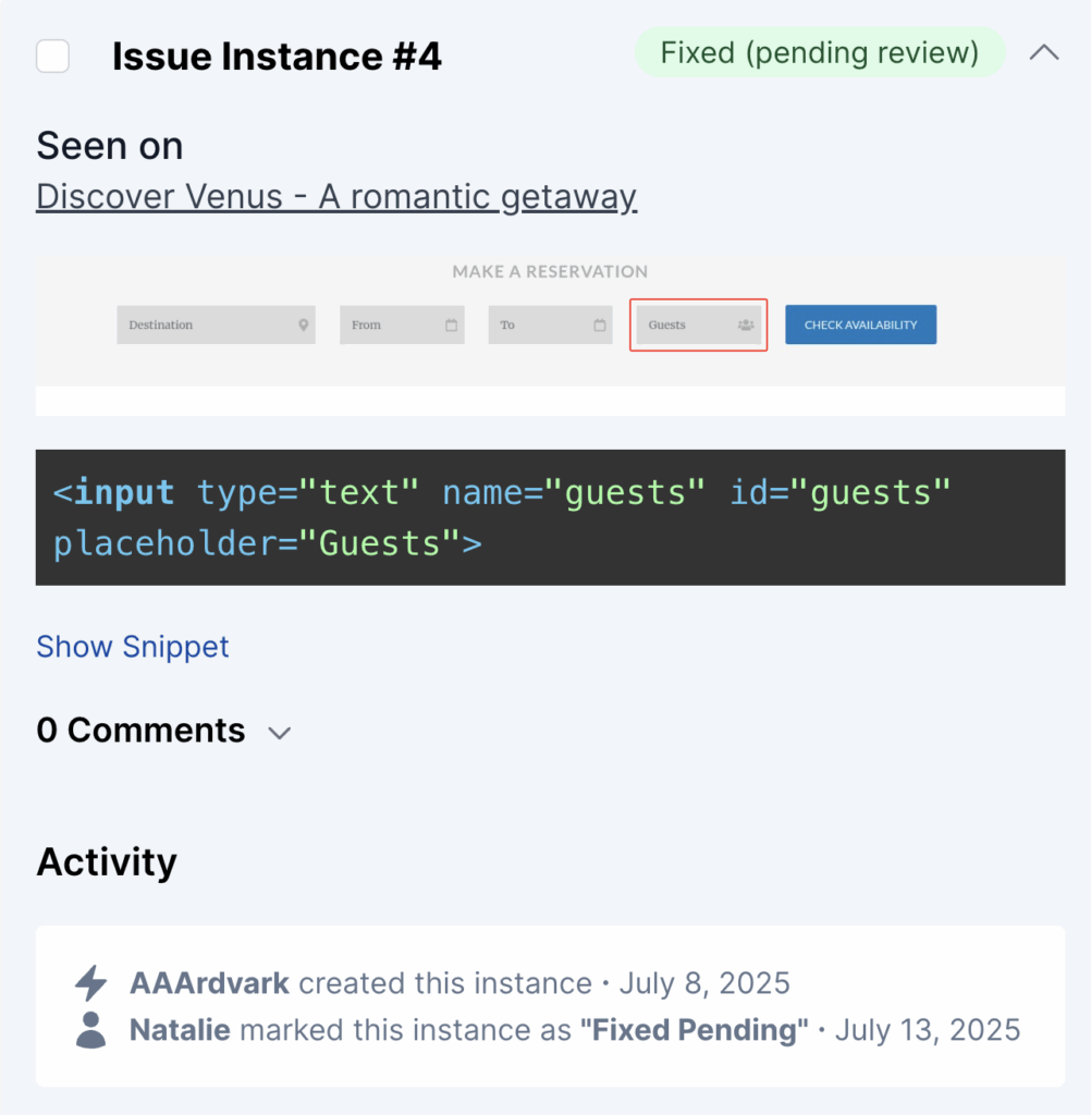 Activity log showing that AAArdvark created Issue Instance #4 on July 8, 2025, and Natalie marked it as “Fixed Pending” on July 13, 2025. Part of a new feature to track who did what and when across issues.