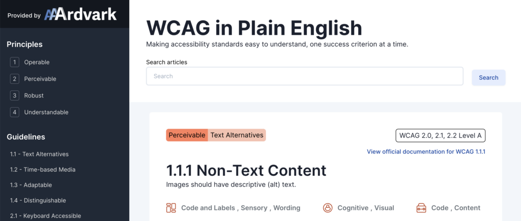 This has been a passion project for Natalie MacLees, the co-founder of AAArdvark, who’s wanted to rewrite WCAG for decades now. With that said, we’ve been hard at work simplifying every article in WCAG 2.2 A and AA for the last three years, and we’re finally ready to launch with what we have. But don’t worry; we’ll continue to work our way through AAA.