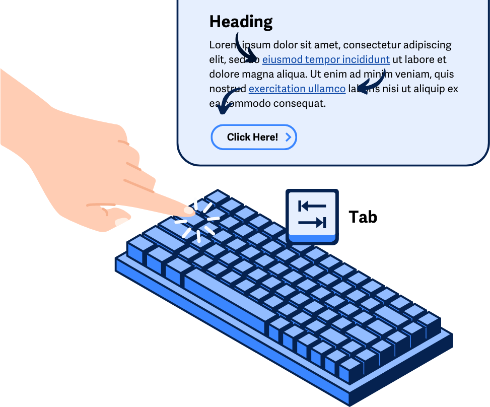 Most functionality on a web page must be usable with just a keyboard. If someone can do it with a mouse, touch, or gesture, they should also be able to do it with the keyboard—with limited exceptions.