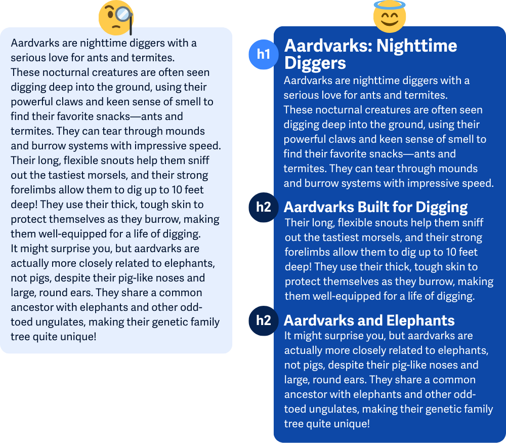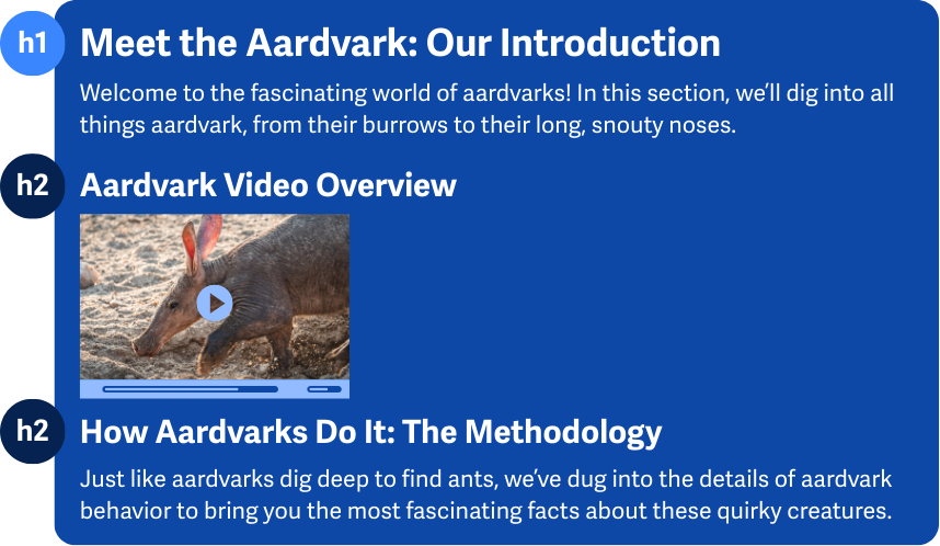 If your page has a primary heading for the "Aardvark Introduction," followed by subheadings like "How Aardvarks Do It" and "The Aardvark’s Big Reveal," make sure they're tagged properly.