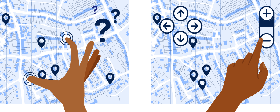 For example, a map allows users to pinch using two fingers across the frame to zoom in and out and swipe to pan. However, two buttons with a plus and minus symbol, as well as navigational arrow buttons, are also placed on the top corner of the map so that the user can zoom and pan across the map without the need to pinch or swipe.
