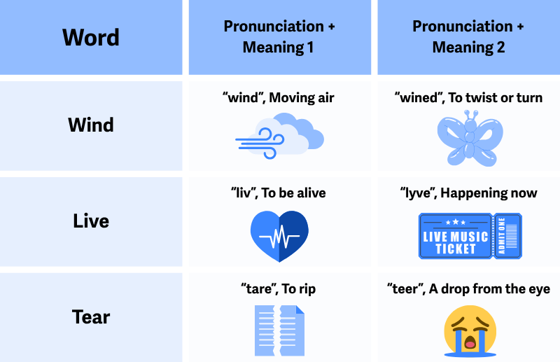 People learning a language can find it challenging when words are spelled the same but sound different because they may not yet know the alternate pronunciations or how context affects meaning.