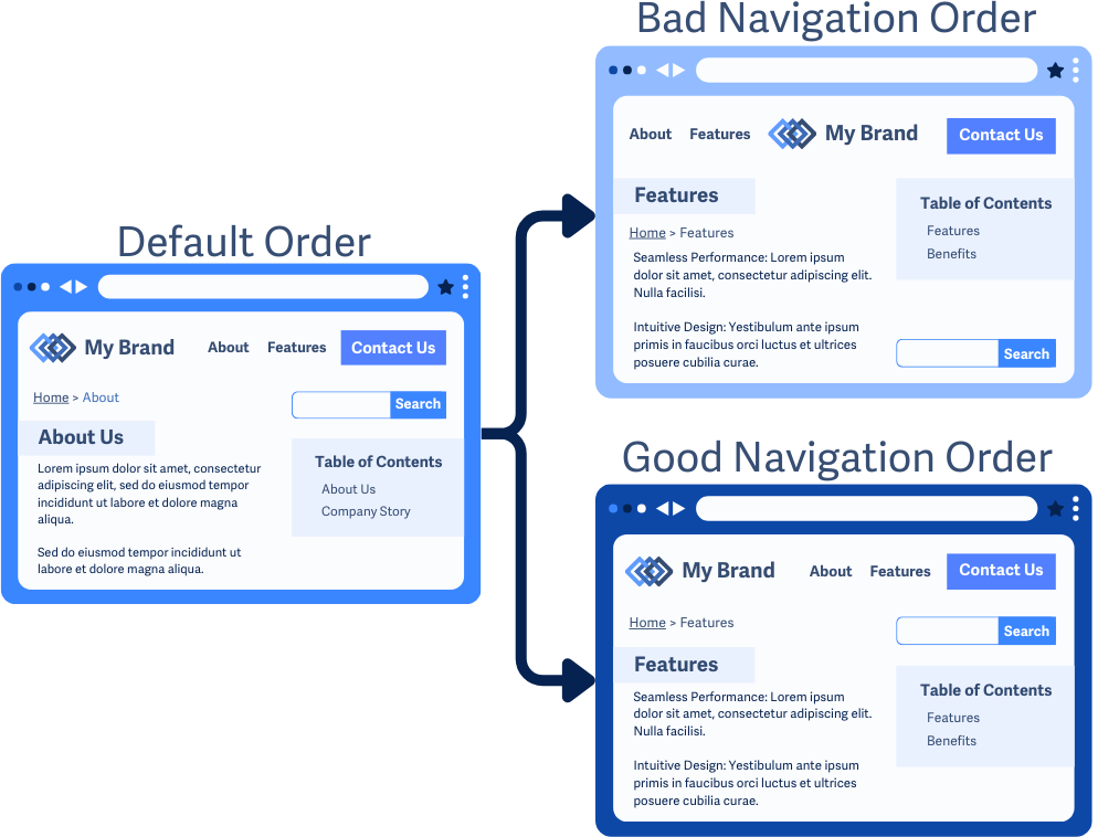 Example of navigation elements keeping the same place and order compared to another page where they change layout and order. In the bad navigation order example, the breadcrumbs changes spots, Table of Contents and the Search bar change order, and the header changes the layout of the menu, contact button and logo.
