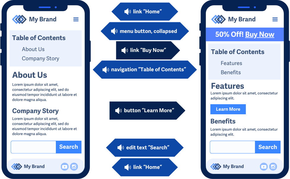 Example showing two pages on a mobile device with navigation elements staying in the same spots and order while other content changes. The text-to-speech for the interactive elements is highlighted, showing the differences between pages while the main navigational elements stay in the same relative position.