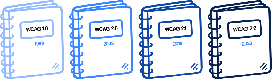 WCAG has evolved through four major releases — WCAG 1.0 (1999), WCAG 2.0 (2008), WCAG 2.1 (2018), and WCAG 2.2 (2023) — with each update expanding the guidance to reflect how the web, devices, and user needs have changed over time.